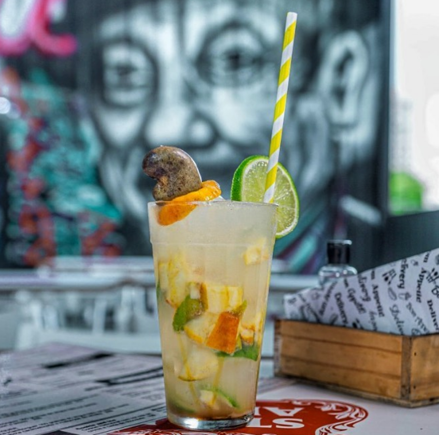 Cachaça Arbórea, caju, melaço de cana e limão.