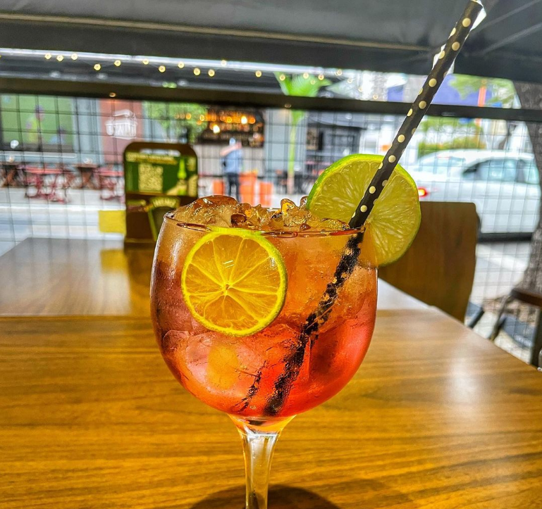 Gin Beefeater, xarope de cranberry, suco de limão e tônica.